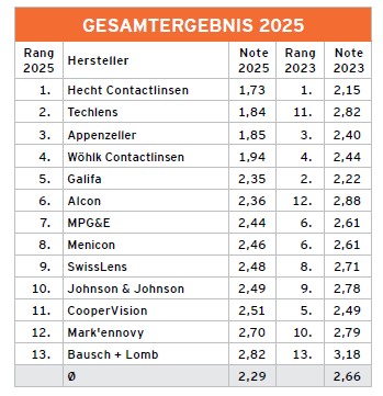 Der Brancheninformationsdienst „markt intern“ führte im November 2025 eine Bewertung der Kontaktlinsenlieferanten durch.